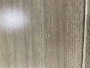 実際についたキズはこちらです。大きなラックが倒れて大きく凹んだキズと、おもちゃが落ちてついたキズです。どちらも補修前後を載せています。